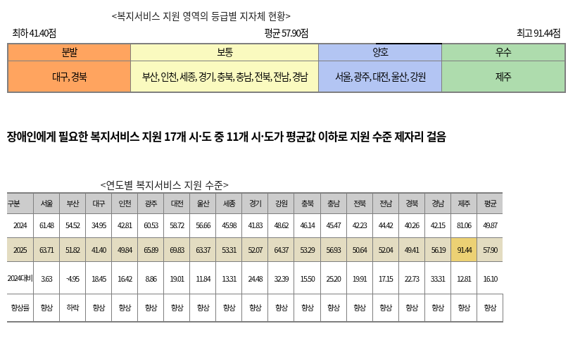 전국적으로는 17개 시·도 중 11개 지역이 평균 점수에 미달해 지역 간 복지 수준의 격차가 여전히 큰 것으로 나타났다. 전북은 이러한 흐름 속에서 중위권을 유지하고 있지만, 상위권인 제주·서울·광주 등과 비교하면 여전히 격차가 존재한다. 전문가는 전북이 한 단계 더 도약하기 위해서는 지속적인 인프라 확충과 장애 특성에 맞춘 맞춤형 서비스 개발, 전문 인력의 안정적 확보가 필수적이라고 지적한다.